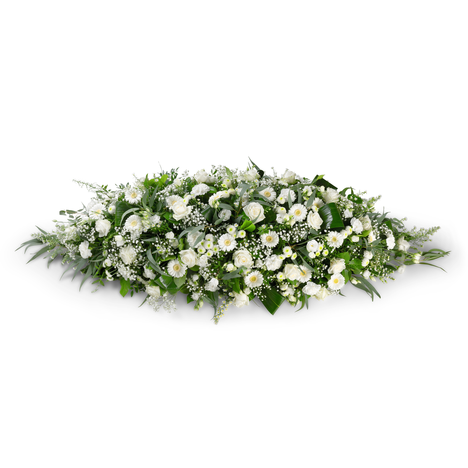 This classic coffin arrangement, featuring white flowers and dark green foliage, exudes calm and serenity. The white flowers convey purity and peace, whilst the deep green creates a sense of tranquillity and natural harmony. A timeless and respectful floral arrangement for a final tribute.