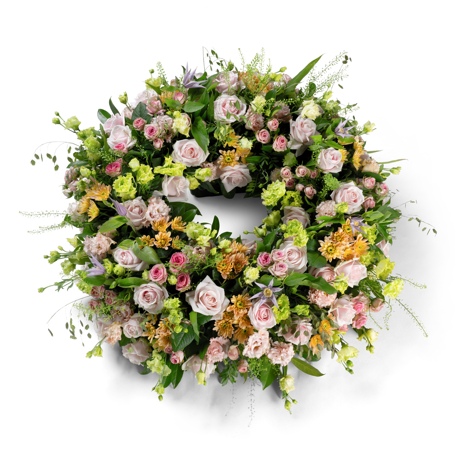 The circular shape symbolises eternity and the enduring bond with a loved one, whilst the pastel colours evoke warmth, gentleness and loving memories. The greenery provides a natural balance and a peaceful frame for the whole arrangement.