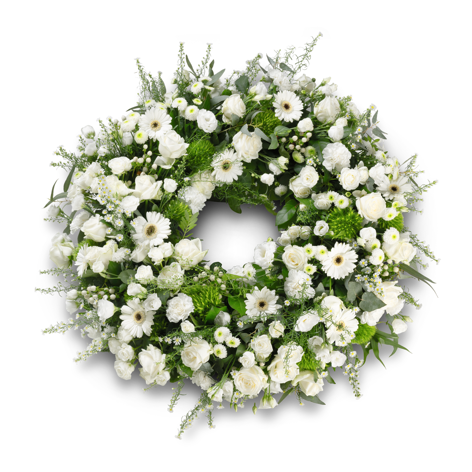 Een klassieke rouwkrans met witte bloemen op een basis van donkergroen blad.
