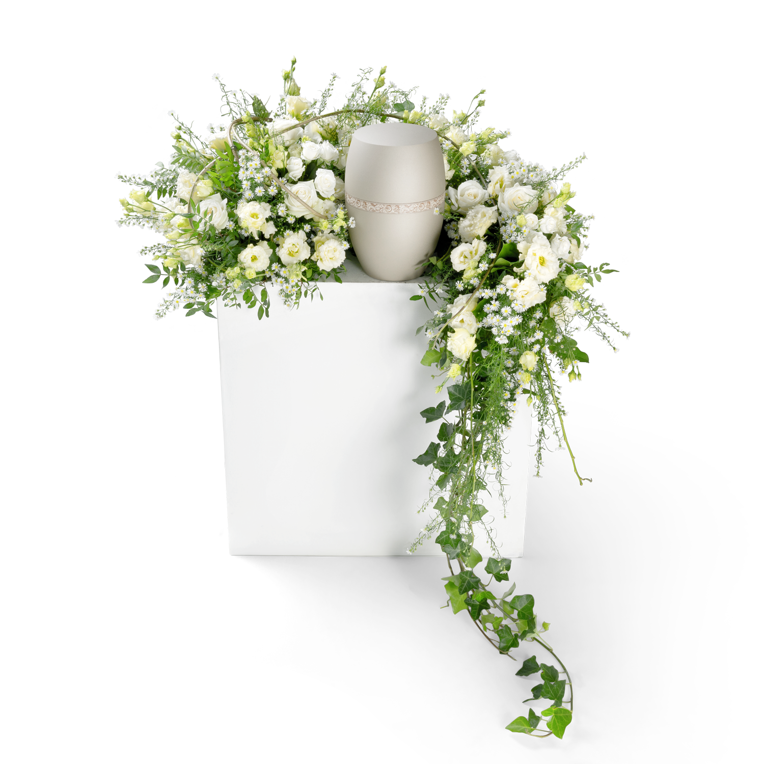 The white flowers symbolise purity, peace and respect, whilst the dark green foliage provides calm and balance. Thanks to its shape and structure, this floral arrangement is particularly suitable for placing on a raised platform next to the urn, so that it hangs down stylishly.