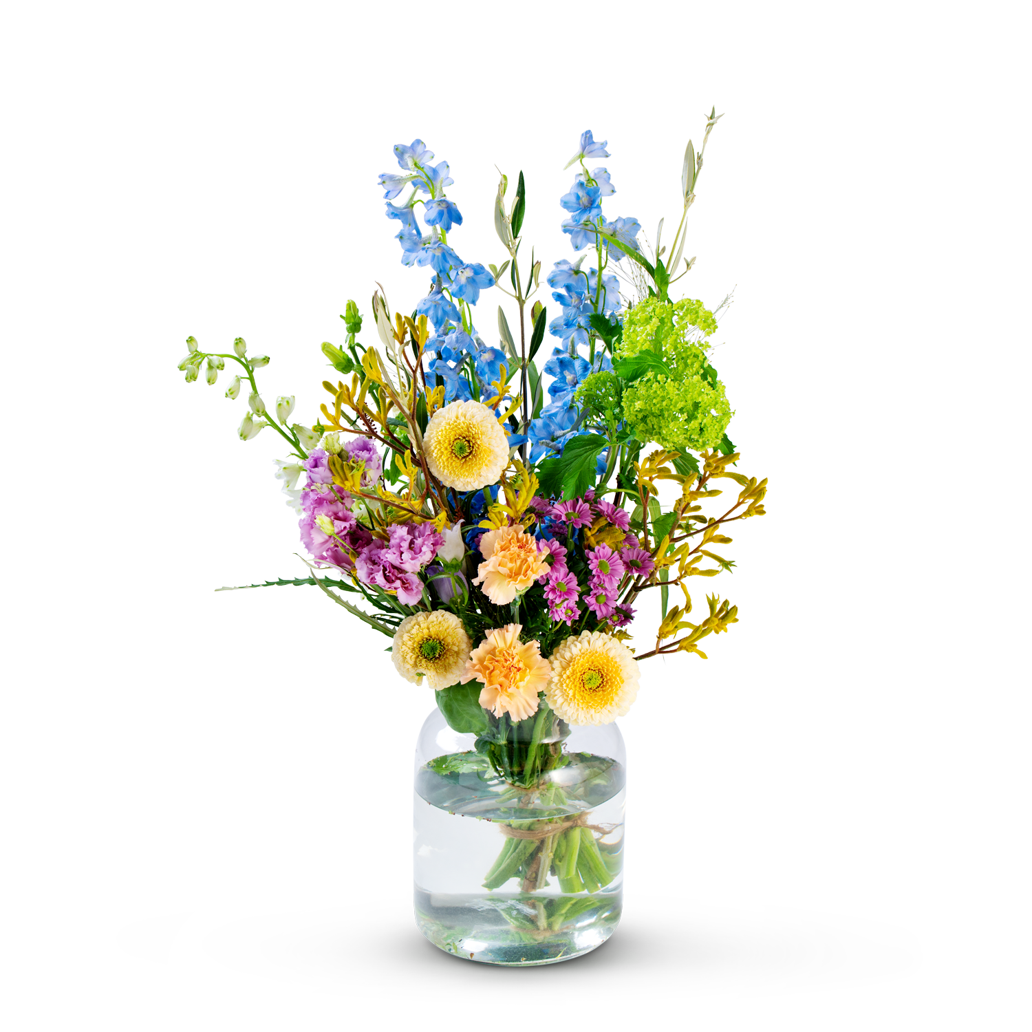 Vous recherchez un bouquet qui apporte immédiatement de la couleur et de la vie dans votre intérieur ? Ce bouquet champêtre combine des nuances fraîches de bleu, de rose et de jaune avec des accents verts naturels et une touche de blanc pour plus de légèreté. La composition décontractée et ludique confère à l'ensemble un aspect spontané et aérien. Un accroche-regard polyvalent et joyeux qui met immédiatement de bonne humeur, remonte le moral de quelqu'un ou fait un cadeau coloré lors d'une fête. Vase non inclus.