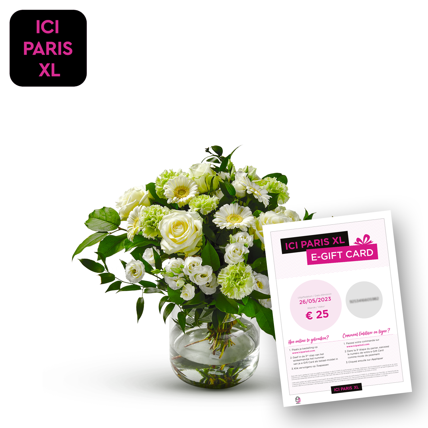 Bouquet blanc avec des touches de Noël argentées.
