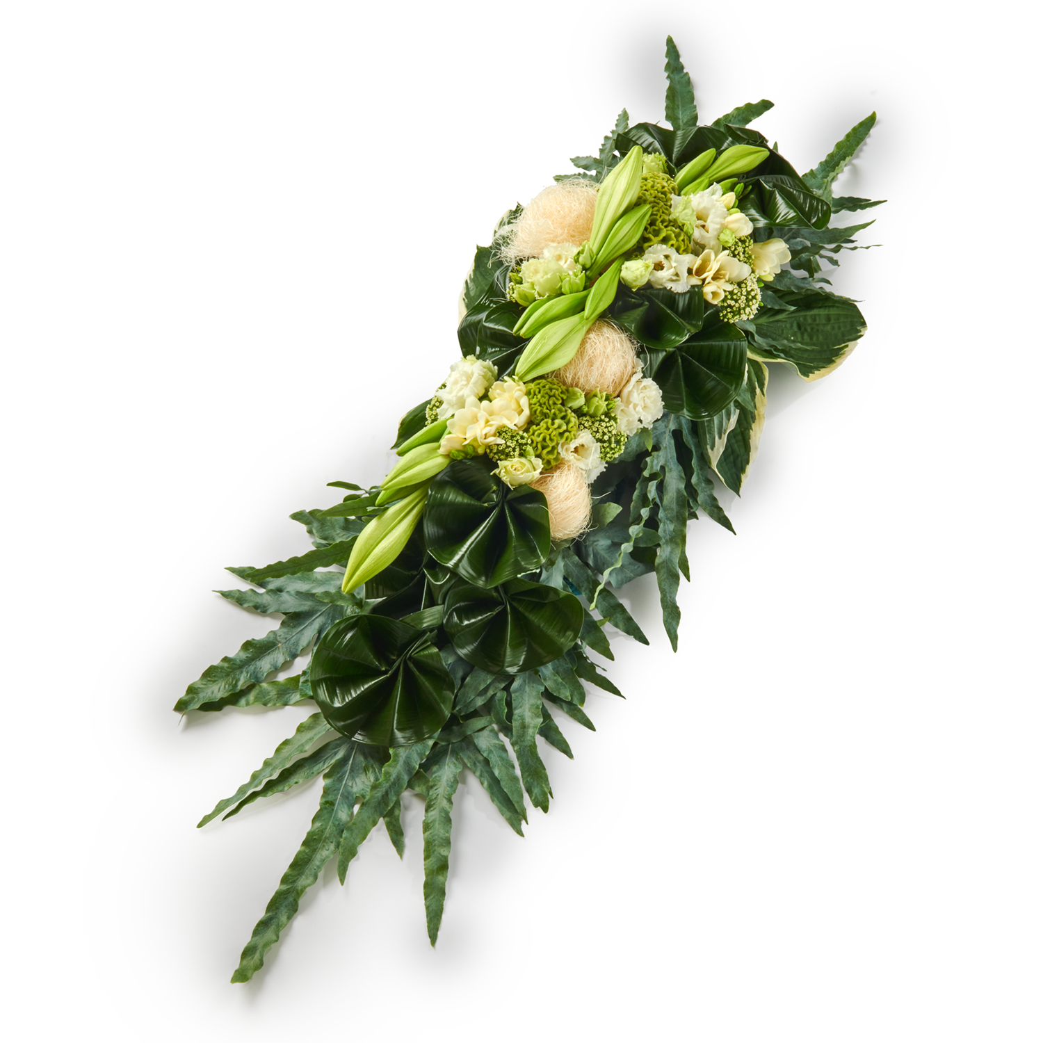 Arrangement funéraire piqué de fleurs blanches allongées avec des accents ronds pour un adieu personnel d'un être cher.