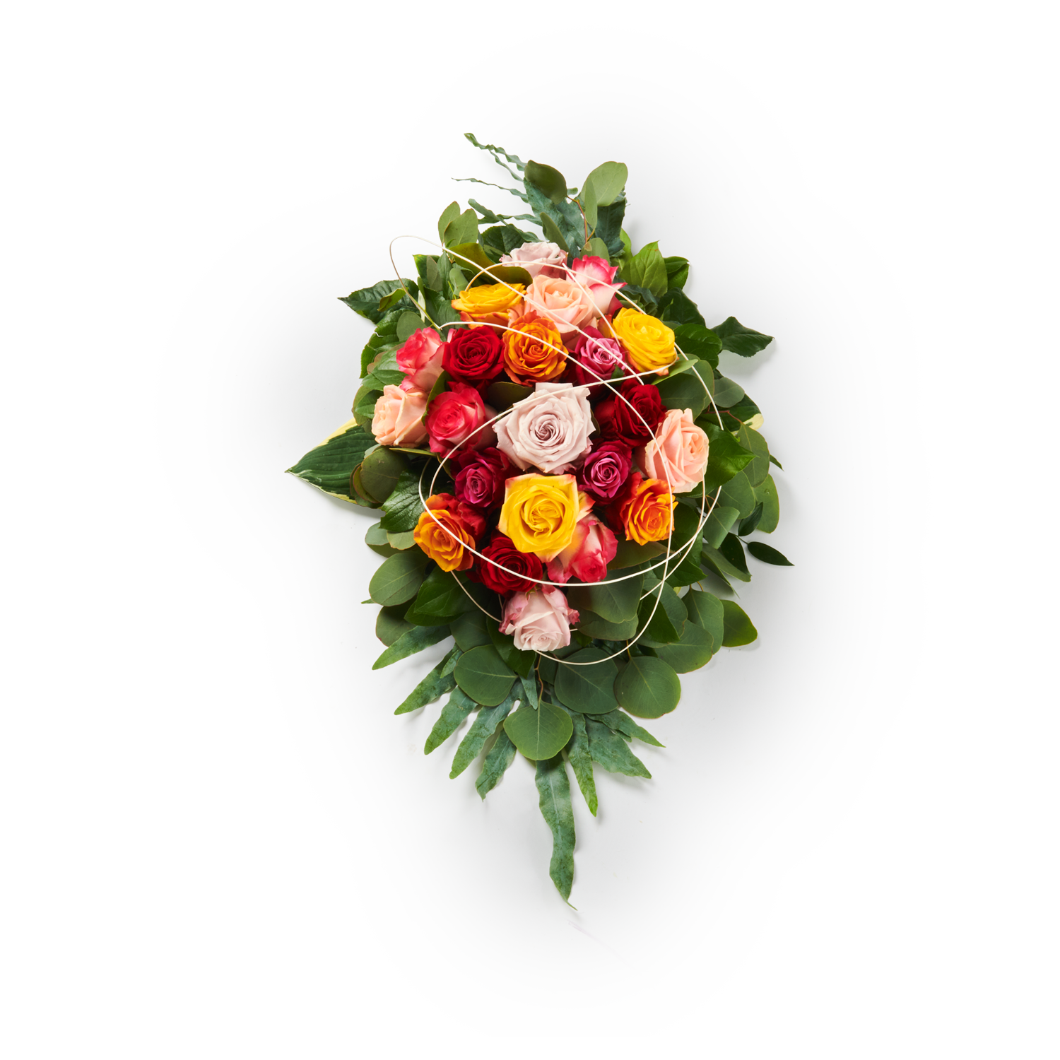 Un dessus de cercueil en forme de goutte avec des roses colorées sur un lit de verdure sobre pour un message de soutien fort.