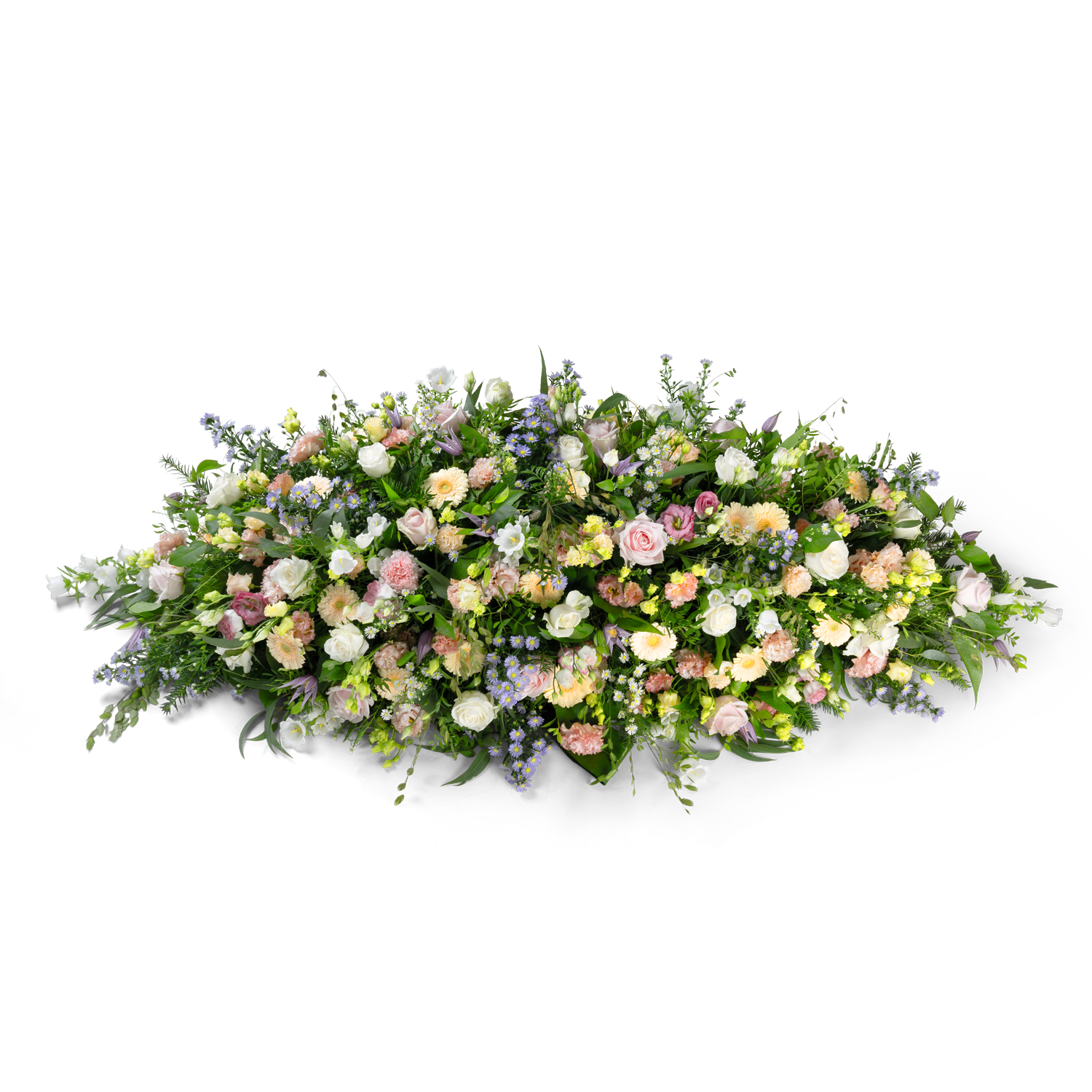 Cette composition funéraire associe des fleurs aux couleurs pastel douces dans un arrangement naturel et décontracté. Les couleurs subtiles et le caractère aérien confèrent à la composition une atmosphère paisible et raffinée.