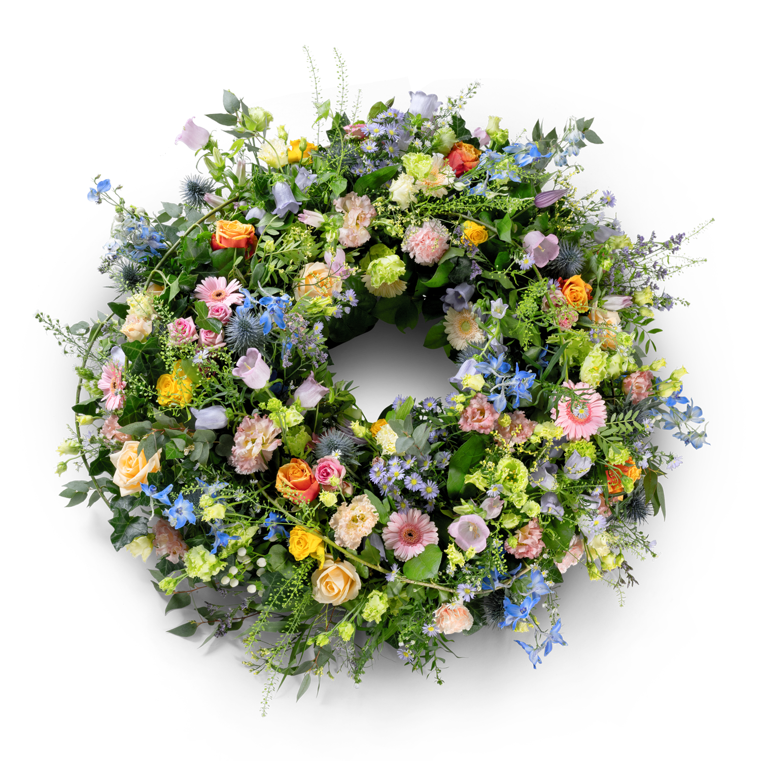 Een kleurrijke rouwkrans met een natuurlijke uitstraling, samengesteld uit bloemen in verschillende tinten