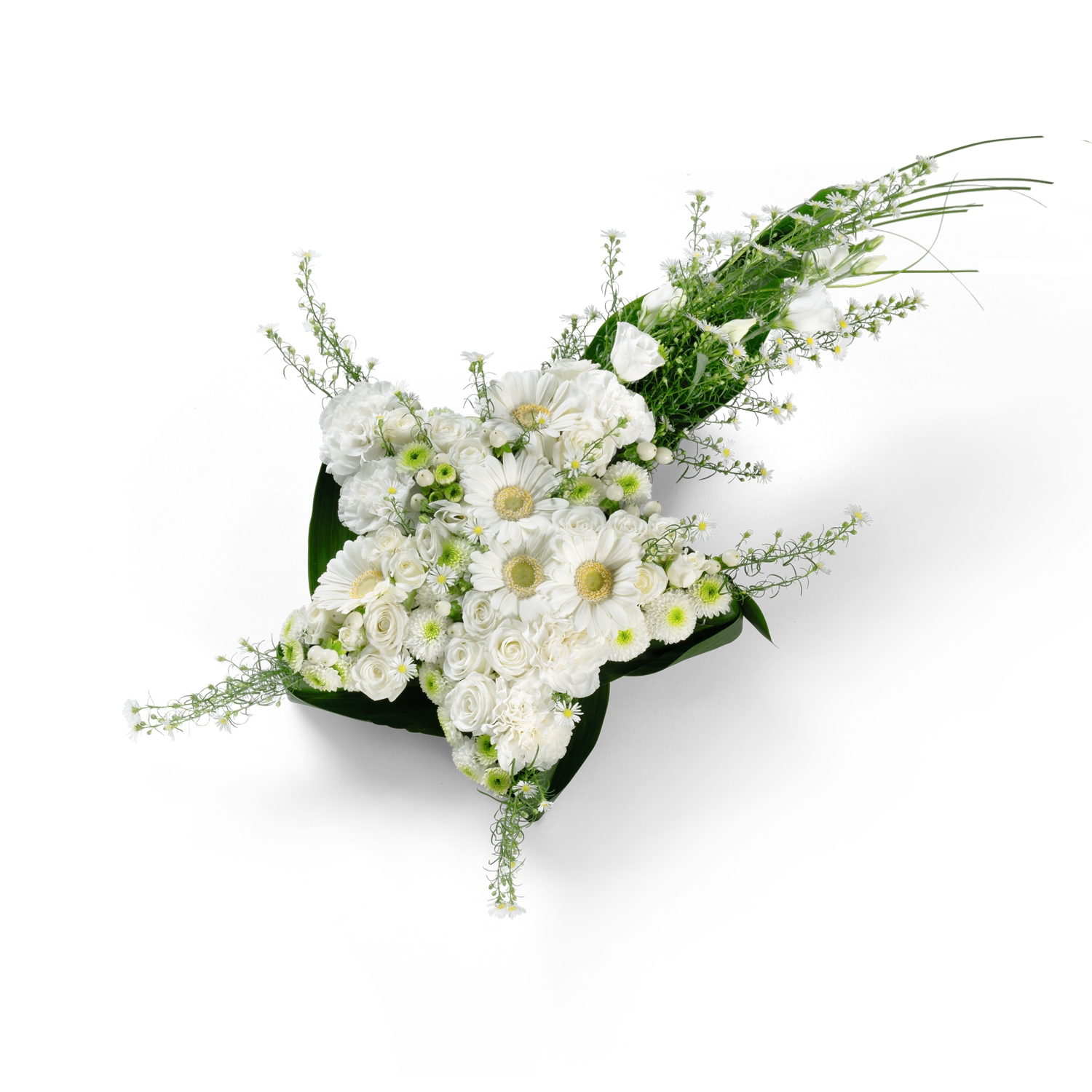 La composition se compose de fleurs blanches délicates qui rayonnent de pureté, de paix et de respect, associées à un feuillage vert frais qui s'étend comme une traîne naturelle à l'arrière de la composition. Cette forme à la fois ludique et élégante confère à l'ensemble une apparence légère et pleine de sens.