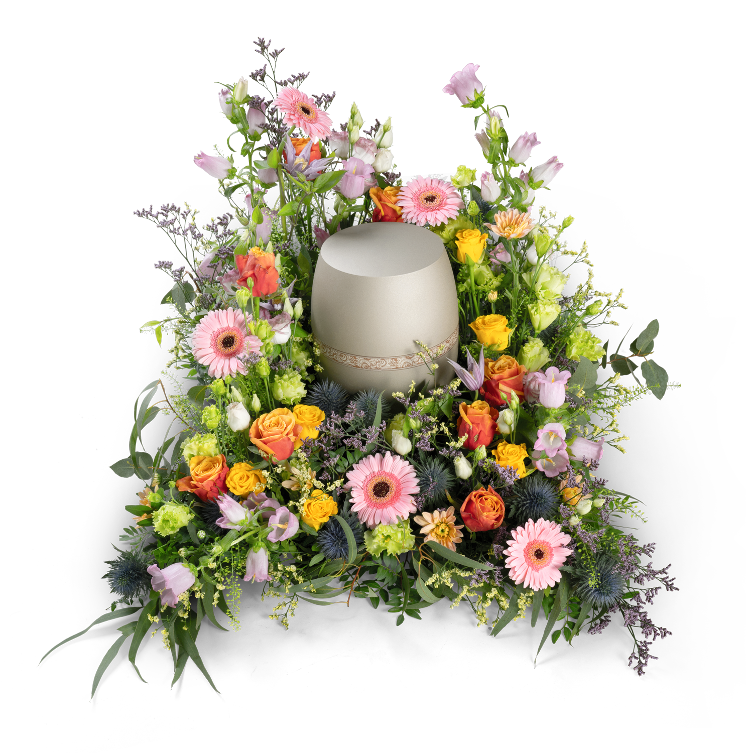 Au centre de la composition, un espace est prévu pour l'urne, lui conférant ainsi une place centrale et significative au sein de l'ensemble. Les fleurs colorées disposées de manière décontractée procurent un sentiment de sécurité et donnent l'impression d'une étreinte chaleureuse. Le caractère naturel de la composition apporte sérénité et connexion avec la nature.