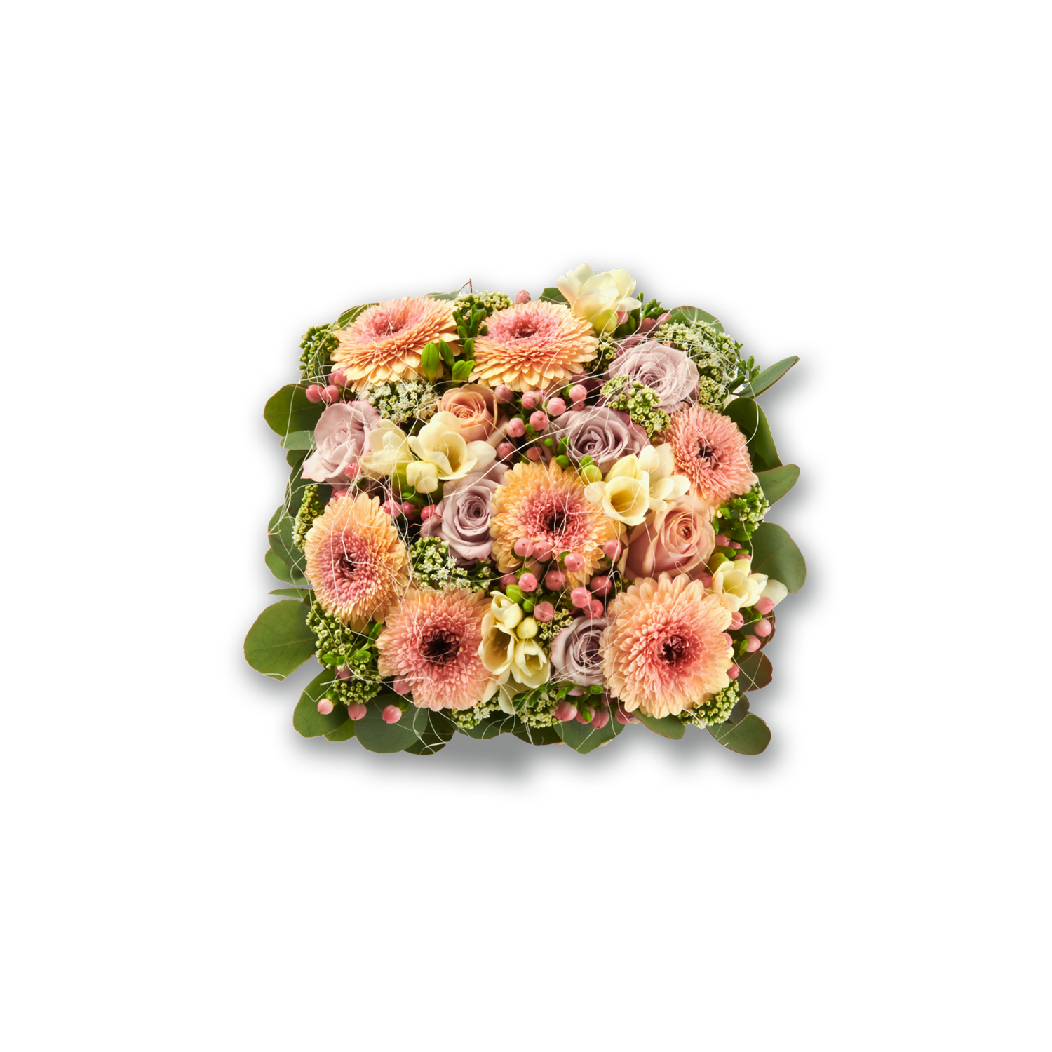 Coussin funéraire piqué court avec les plus belles fleurs de saison. Les douces teintes pastel donnent une sensation de sécurité et de soutien.