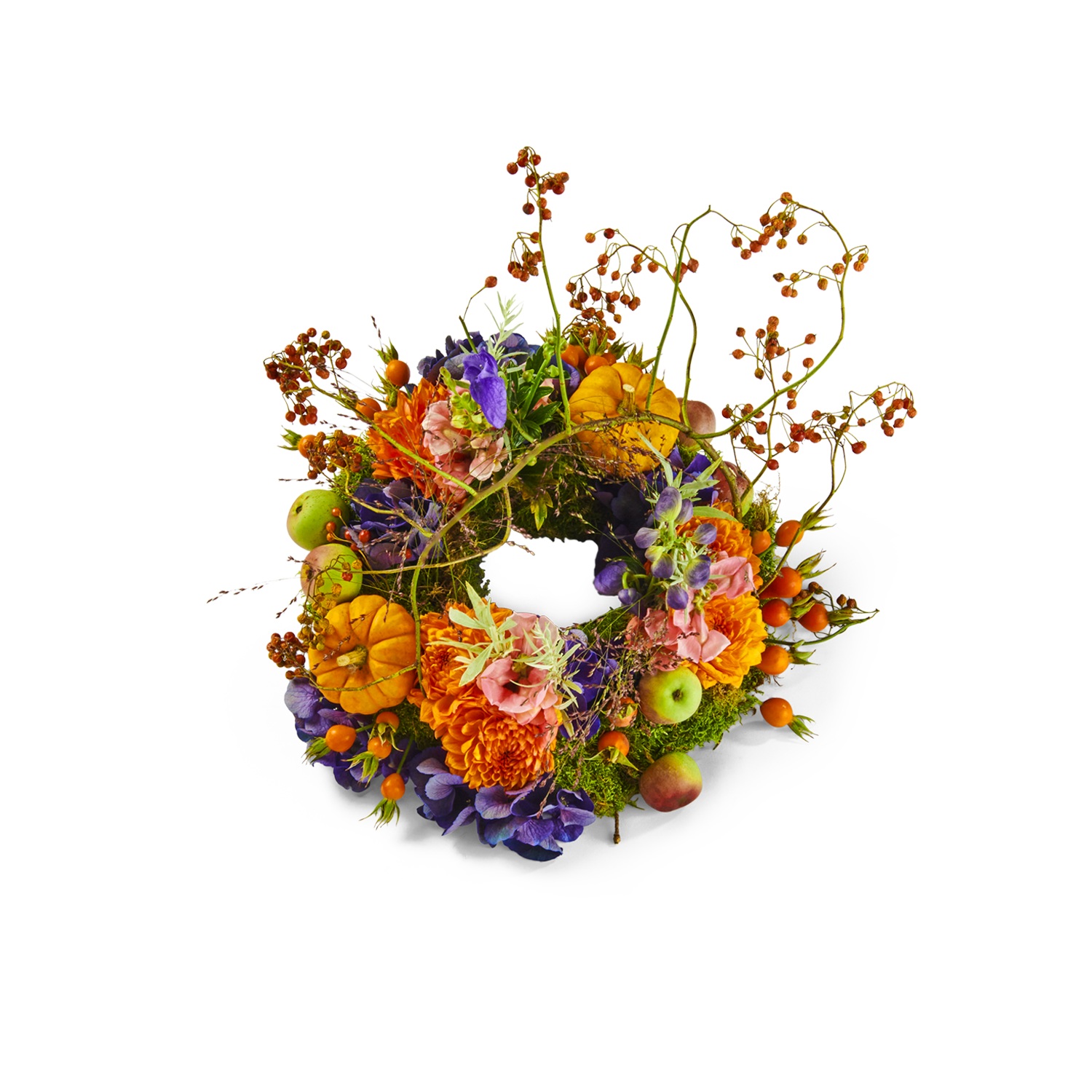 Op zoek naar een atypische herfstkrans? Deze krans werd iets wilder gestoken maar door het gebruik van de pompoentjes en het orange kom je direct in de herfstsfeer.