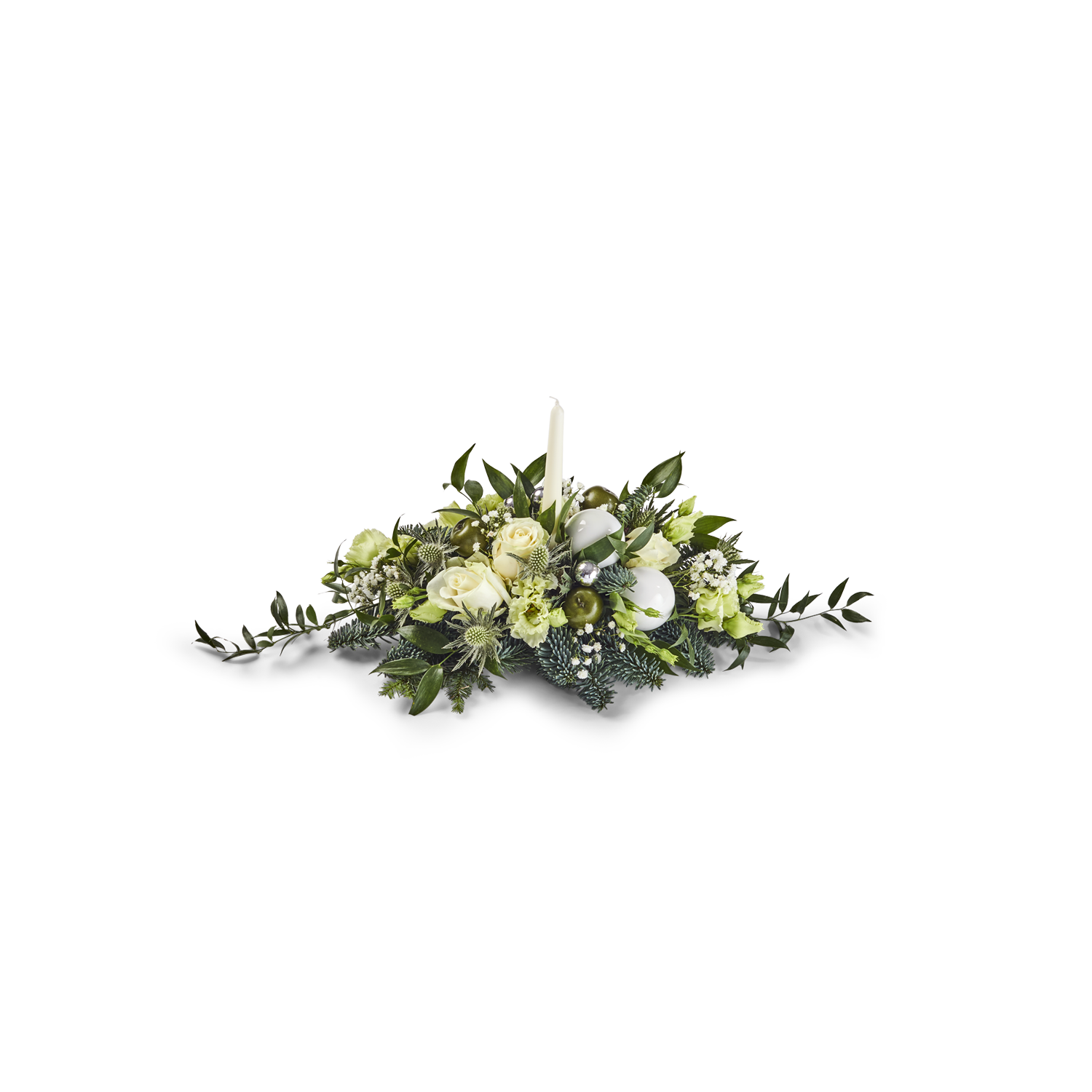 Dit mooie tafelstuk in witte tinten is het ideale eindejaarsgeschenk. Door het gebruik van witte kleuren kan hij zowel op de Kersttafel als op het nieuwjaarsontbijt. Door het gebruik van steekschuim blijven de bloemetjes lange tijd goed zodat er lang van genoten kan worden.
