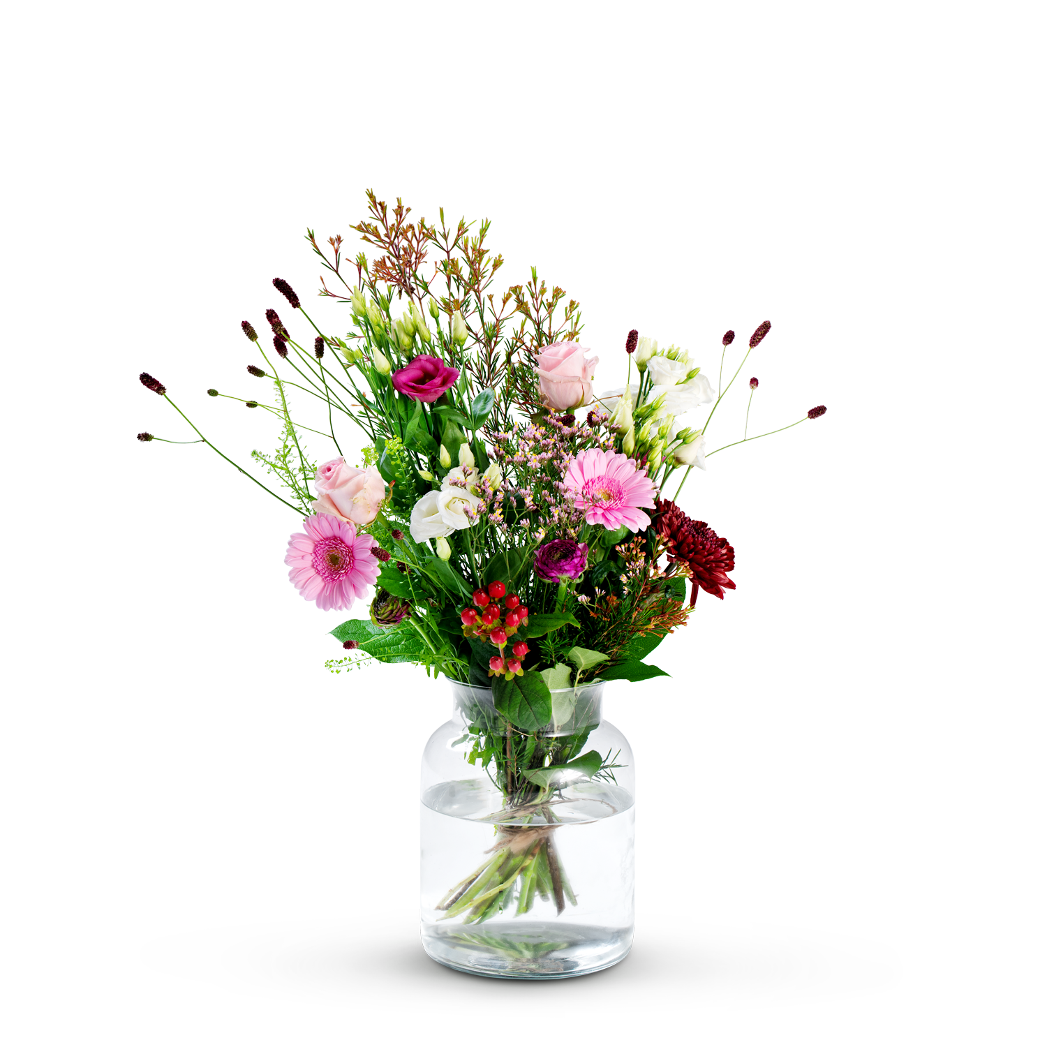 Pak dit najaar uit met een speels en liefdevol gebaar. Dit plukboeket combineert verschillende roze tinten – van zacht tot diep rood met andere najaarselementen. De witte accenten zorgen voor een luchtig geheel. De losse, natuurlijke schikking geeft het boeket een speelse en tegelijk vurige uitstraling. Een krachtig en romantisch teken dat warmte, emotie en karakter brengt in elke ruimte.