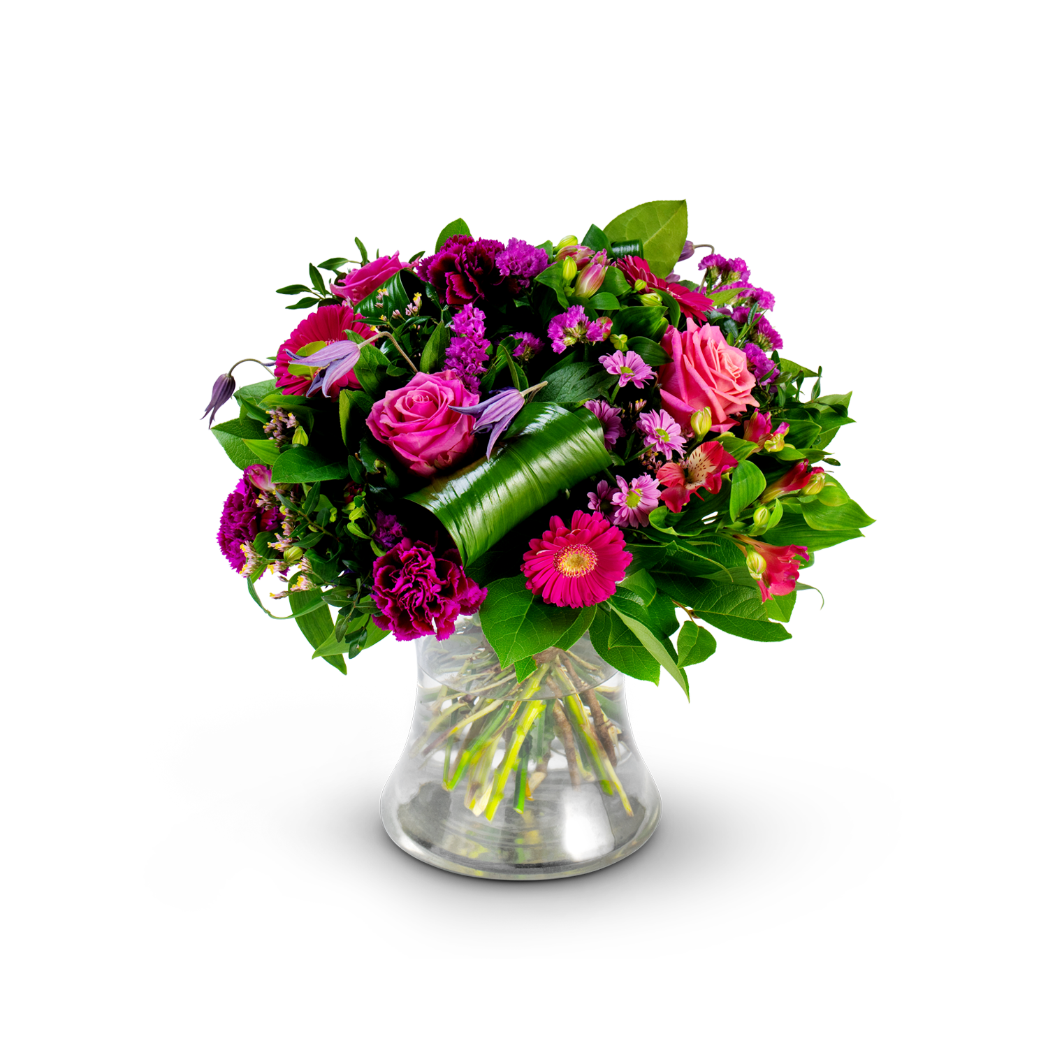 Mag het wat intenser en karaktervoller? Dit boeket combineert diepe fuchsia en paarse tinten tot een krachtig en stijlvol geheel, rijkelijk omringd door fris groen. De volle kleuren zorgen voor een elegante uitstraling met een natuurlijke toets. Een uitgesproken boeket dat warmte en diepte brengt in elke ruimte. Samenstelling kan variëren.