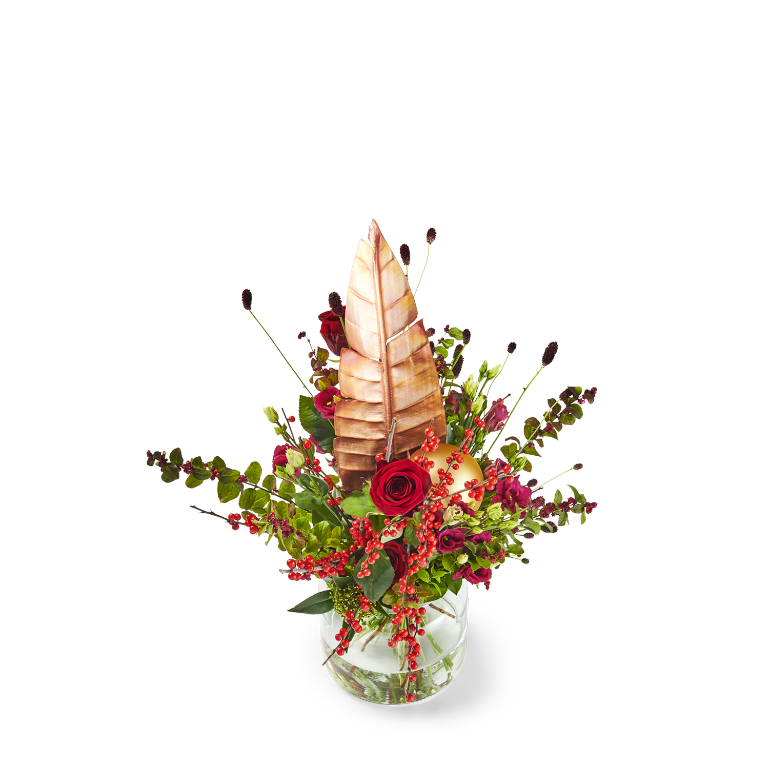 Modern Kerstboeket waarbij in de hoogte gewerkt wordt.