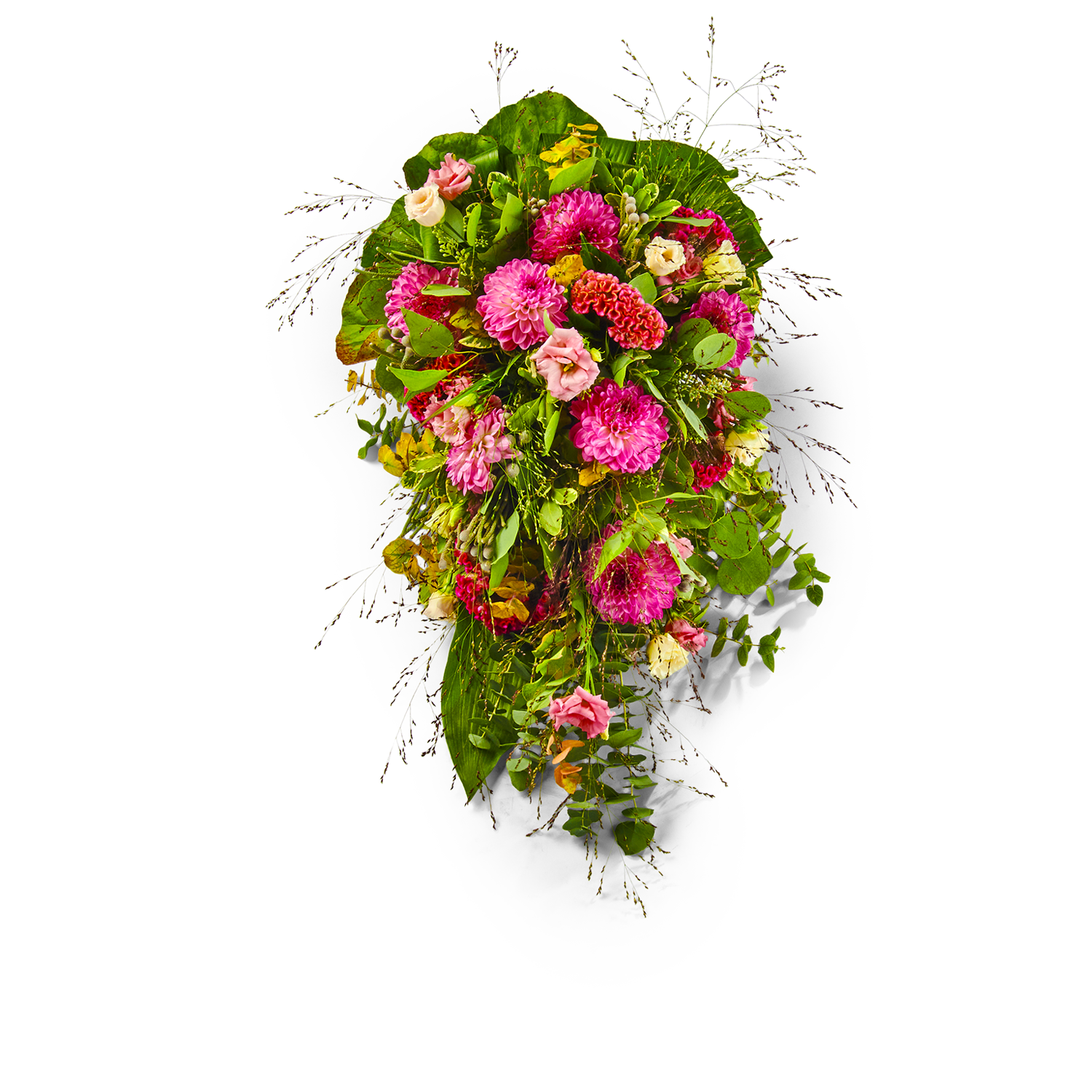 Opvallend rouwstuk in druppelvorm. Het is een echte eyecatcher door zijn opvallend kleurgebruik.