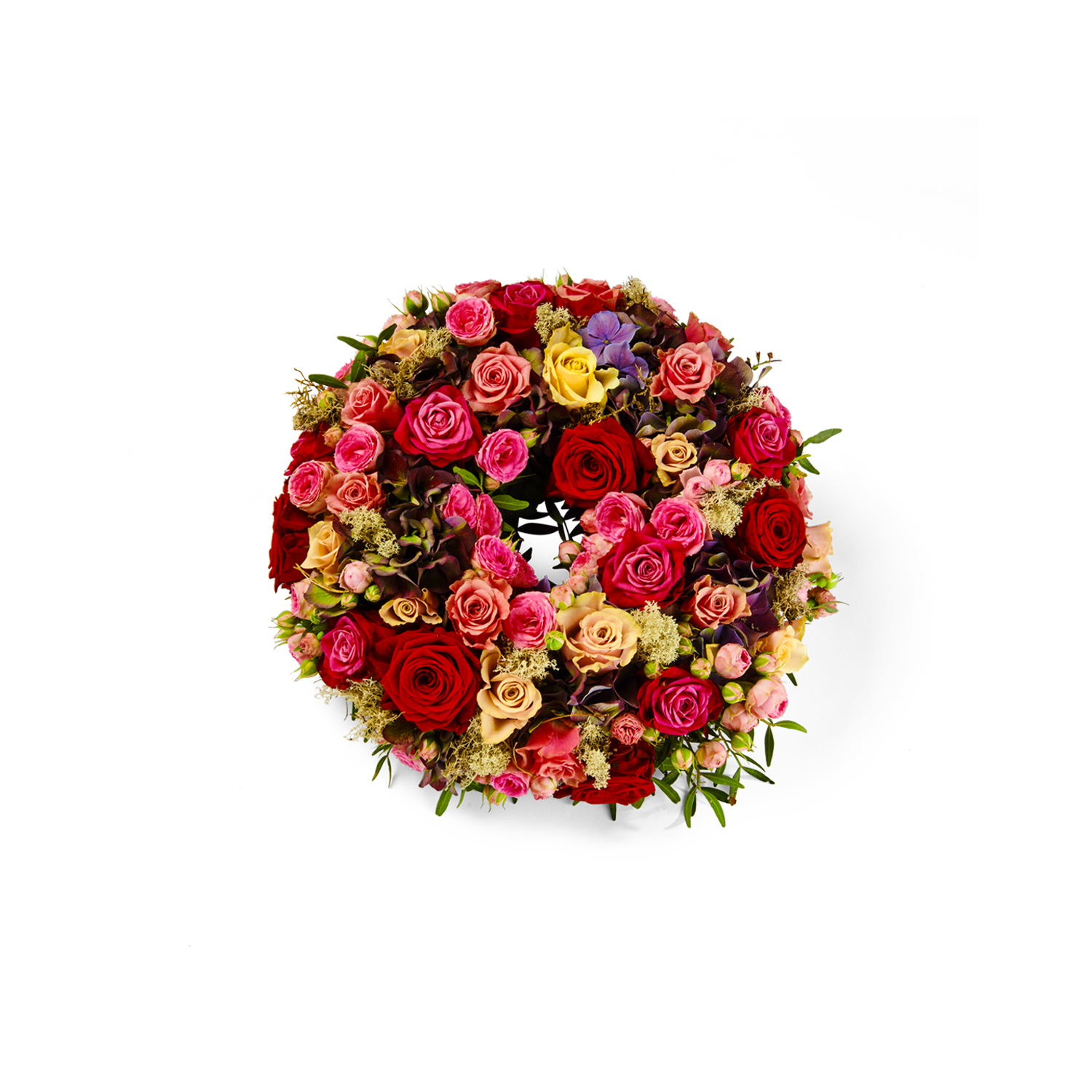 Deze smaakvolle rozenkrans voelt een beetje retro aan door het gebruik van de verschillende soorten rozen. Het afscheid voelt met deze krans heel liefdevol aan.