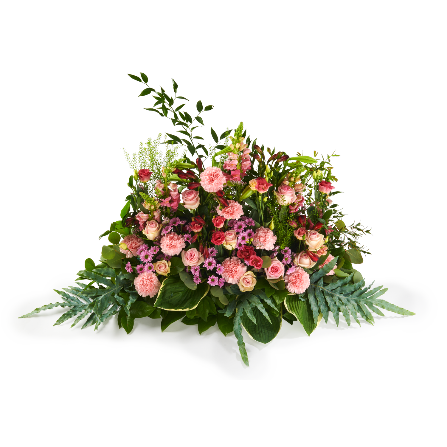 Hoog opgestoken grafstuk in bonte, roze tinten om de herinnering aan iemand sterk te houden.