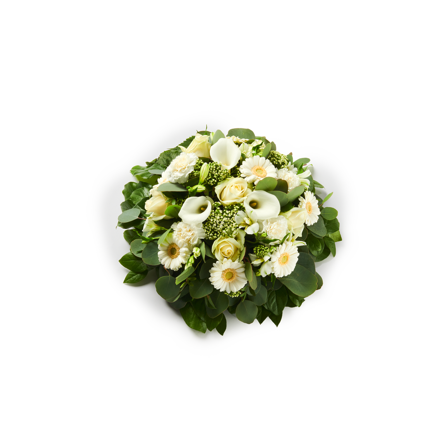 Compact gestoken seizoensbloemen in een ronde ondergrond. De zachte kleuren op een ondergrond van bladmateriaal geven het gevoel van een blijvende verborgen aanwezigheid.