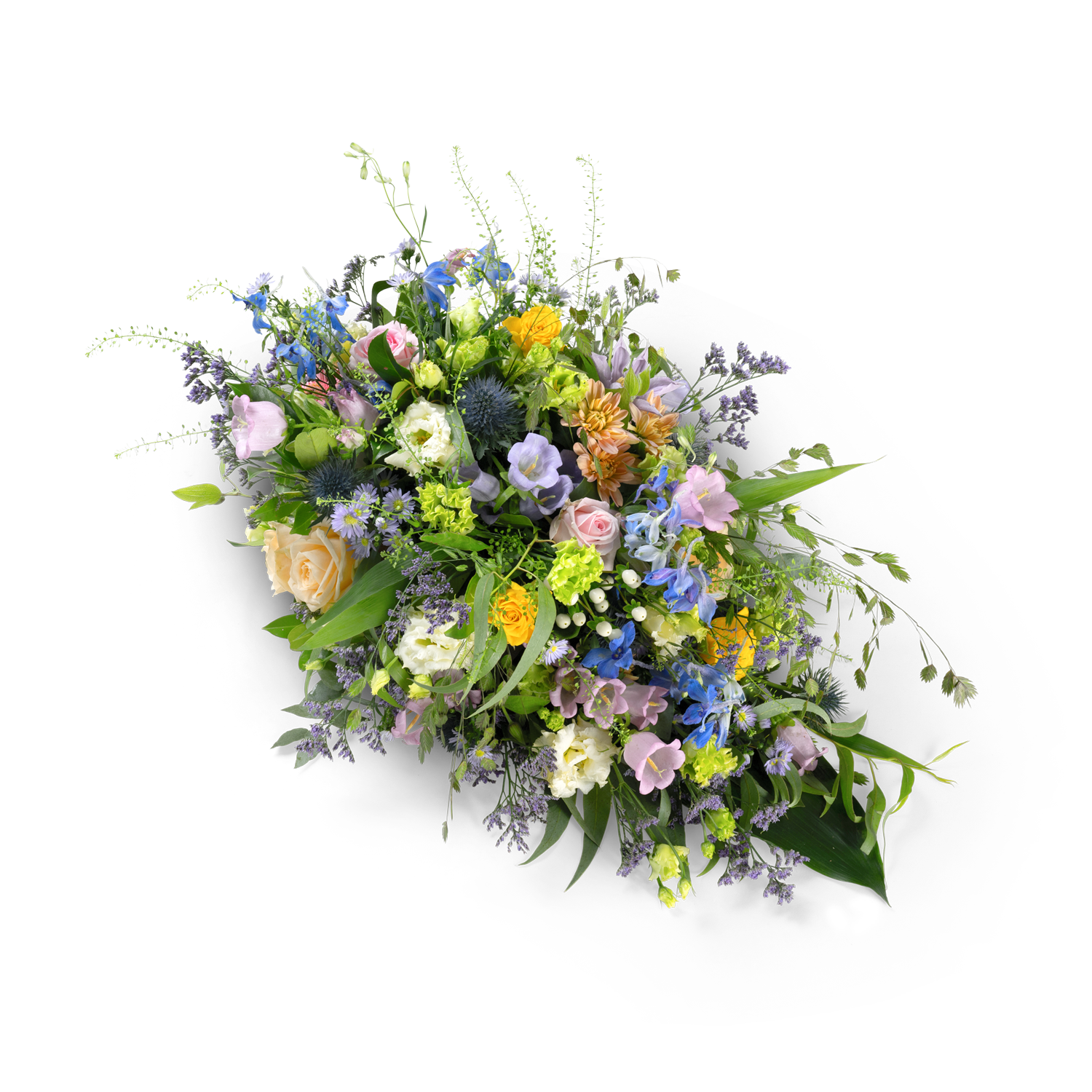 Een natuurlijke graftak in druppelvorm met bloemen in verschillende kleuren, geïnspireerd op een bloemenweide.  Deze graftak in druppelvorm heeft een natuurlijke en spontane uitstraling, met bloemen in verschillende tinten. De compositie doet denken aan een plukboeket uit een bloemenweide en straalt warmte uit. De natuurlijke kleuren symboliseren herinneringen, liefde en verbondenheid. Een persoonlijk en liefdevol eerbetoon om een dierbare te eren en te herdenken.