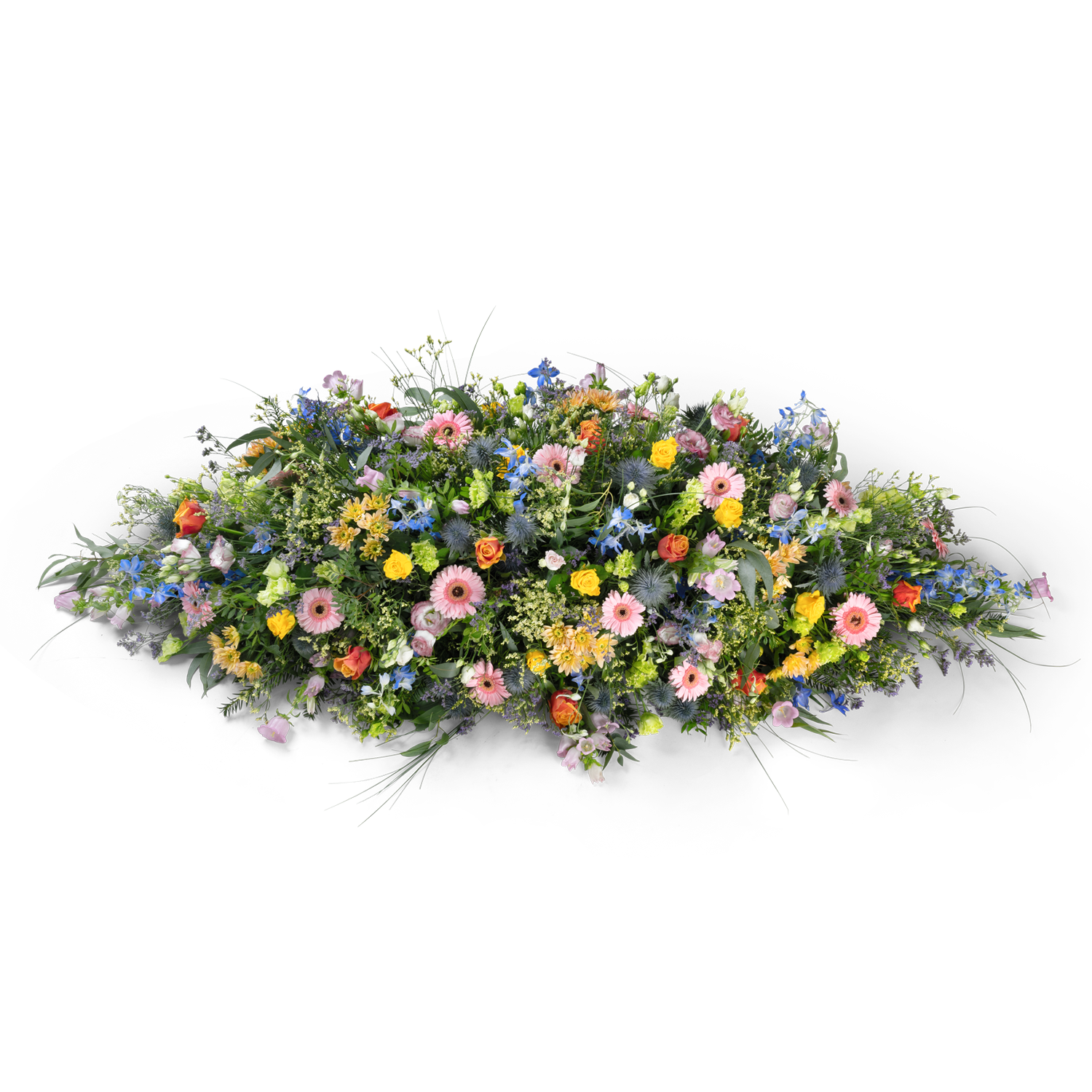 Dit rouwstuk zorgt voor een heel natuurlijke en levendige uitstraling. De compositie bestaat uit bloemen in verschillende kleuren, los en speels geschikt, waardoor het geheel doet denken aan een kleurrijke plukweide.