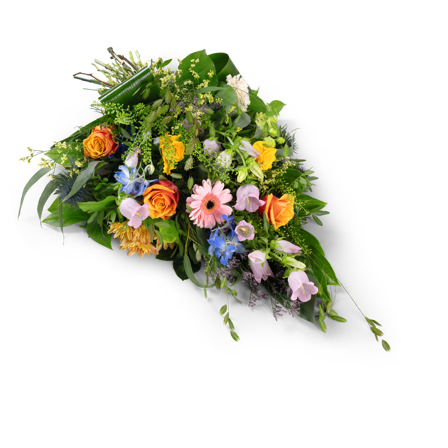 Dit natuurlijke legboeket met bloemen in verschillende kleuren brengt een warme en persoonlijke sfeer. De combinatie van kleuren symboliseert liefdevolle herinneringen en het vieren van een leven. De losse en natuurlijke stijl zorgt voor een oprechte en troostende uitstraling.