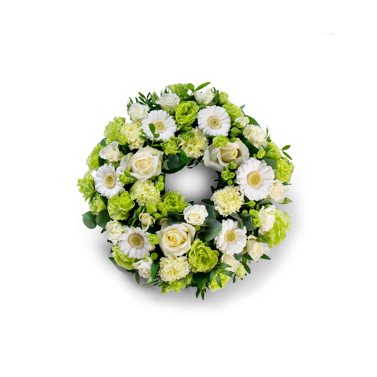 Deze klassieke rouwkrans, met veel wit en groen, is als een oneindige cirkel. Deze krans is een mooi gebaar om je respect te betuigen tijdens de uitvaartceremonie, op de begraafplaats of een laatste rustplaats.