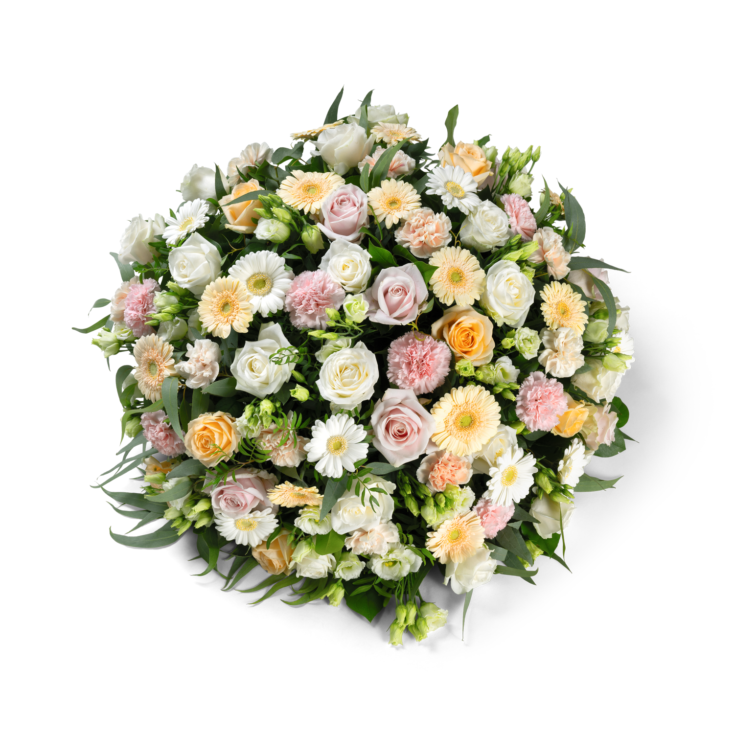 Dit rouwkussen in Biedermeier is samengesteld uit bloemen in zachte pastelkleuren en heeft een verzorgde, klassieke uitstraling. De compacte en harmonieuze schikking zorgt voor een evenwichtig geheel dat rust en verfijning uitstraalt.