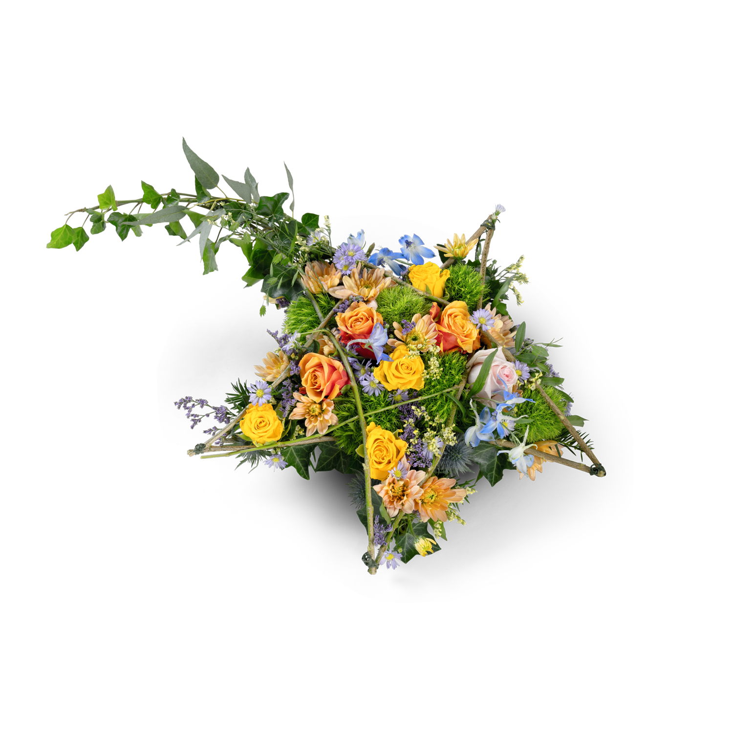 Dit bijzondere bloemstuk in de vorm van een ster combineert bloemen in verschillende kleuren tot een levendig en natuurlijk geheel. De losse, wilde schikking geeft het stuk een spontane uitstraling, alsof het rechtstreeks uit een bloemenveld komt.