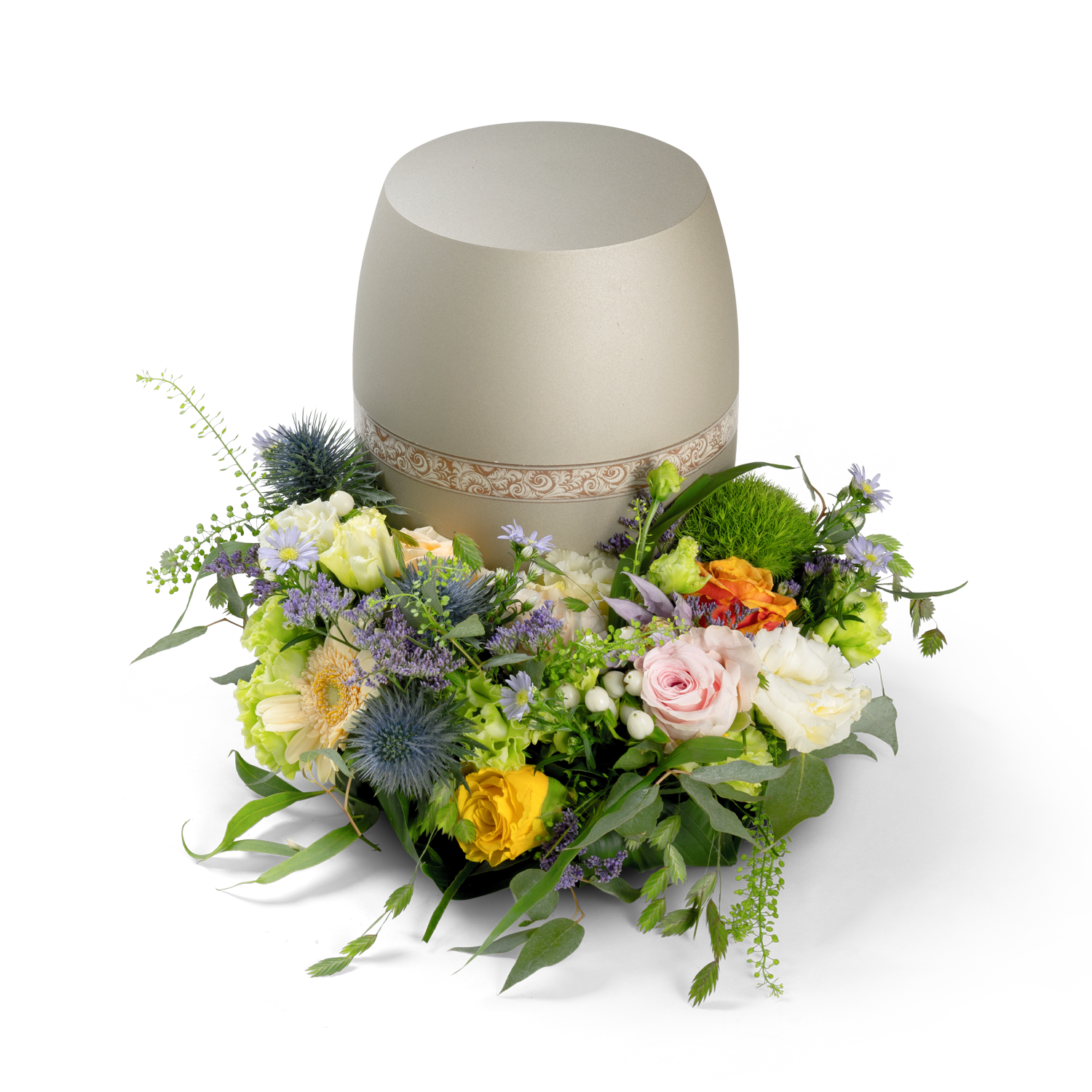 De halve cirkelvorm maakt het bloemstuk bijzonder geschikt om rond een urne te plaatsen. De wilde, natuurlijke schikking en de variatie aan kleuren zorgen voor een persoonlijk en oprecht eerbetoon.